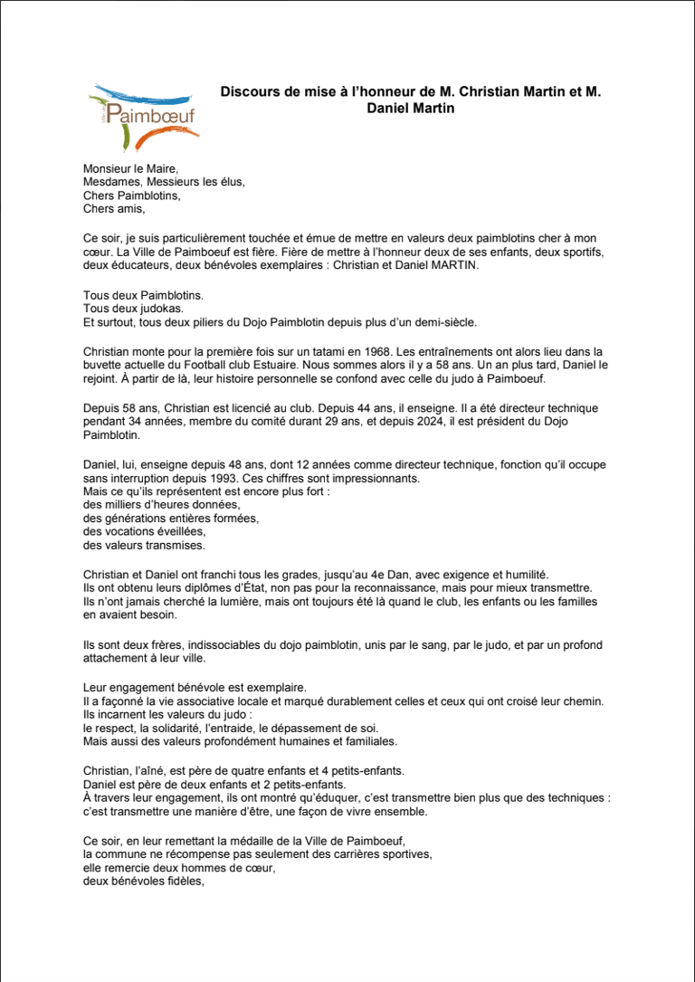 Vendredi 10 janvier, la Ville a honoré Daniel Martin et Christian Martin en leur remettant la médaille de la Ville, en reconnaissance de leur engagement et de leur contribution exemplaire au judo et à la vie sportive locale.